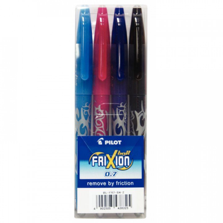 Pochette de 4 rollers Frixion Ball fun assortis. Ecriture moyenne, pointe 0.7 mm, tracé 0,4 mm. Encre gel thermosensible : il écrit, efface et réécrit. Effaçage par frottement et échauffement de l'embout gomme sur le papier. Grip caoutchouc. Grande douceur d'écriture, idéal pour l'école. Rechargeable. Couleurs fun assorties : turquoise, fuchsia, violet, orange.