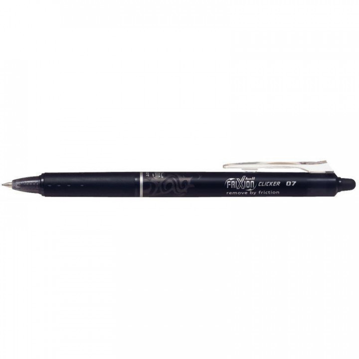 Roller Frixion Clicker noir. Ecriture moyenne, pointe 0,7 mm, tracé 0,4 mm. Encre gel thermosensible : il écrit, efface et réécrit. Effaçage par frottement et échauffement de l'embout gomme sur le papier. Grip caoutchouc. Grande douceur d'écriture. Rétractable et rechargeable.