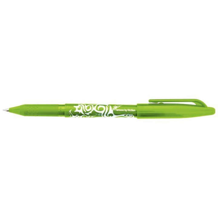 Roller Frixion Ball vert pomme. Ecriture moyenne, pointe 0,7 mm, tracé 0,4 mm. Encre gel thermosensible : il écrit, efface et réécrit. Effaçage par frottement et échauffement de l'embout gomme sur le papier. Grip caoutchouc. Grande douceur d'écriture, idéal pour l'école.