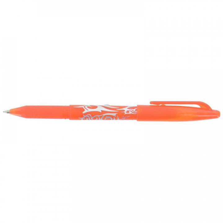 Roller Frixion Ball orange. Ecriture moyenne, pointe 0,7 mm, tracé 0,4 mm. Encre gel thermosensible : il écrit, efface et réécrit. Effaçage par frottement et échauffement de l'embout gomme sur le papier. Grip caoutchouc. Grande douceur d'écriture, idéal pour l'école.