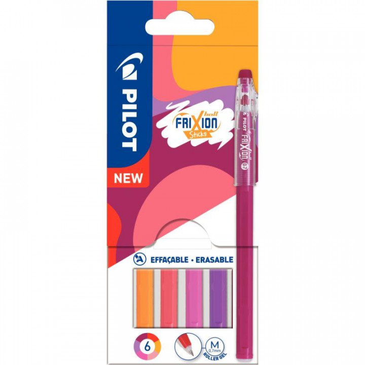Pochette de 6 rollers frixion ball stick tons chauds. Pointe moyenne de 0,7 mm, tracé 0,4 mm. Coloris : rouge, orange, corail, rose, mauve, bordeaux.