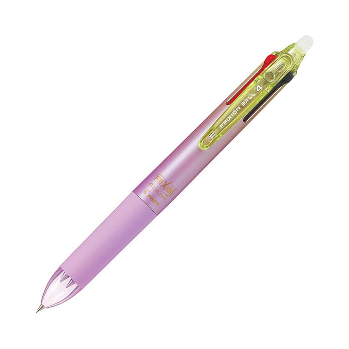Stylo bille 4 couleurs Frixion Ball violet dégradé. Equipé de 4 recharges : noir, bleu, rouge, vert. Encre effaçable thermosensible. Rechargeable. Pointe fine 0.5mm.