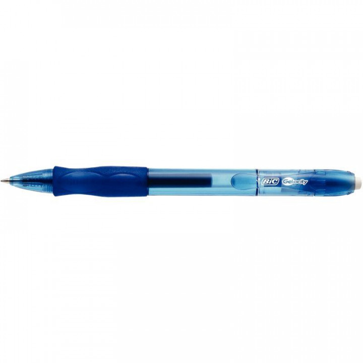 Stylo gel Gélocity original bleu. Ecriture moyenne, pointe de 0,7mm, tracé de 0,4mm. Corps transparent avec grip en caoutchouc. Rétractable.