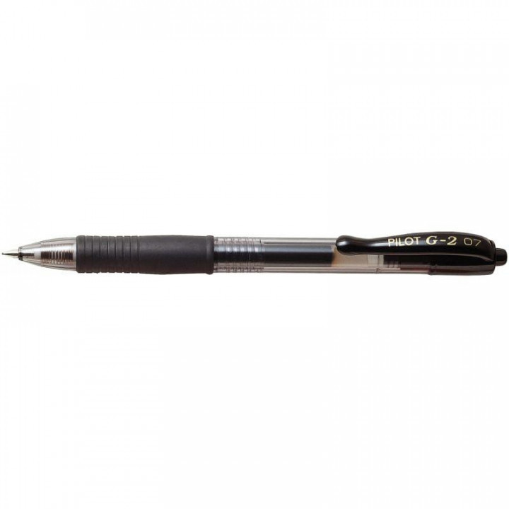 Roller gel G2 noir. Ecriture moyenne, pointe 0.7 mm. Tracé 0.4 mm. Bille en carbure de tungstène, encre gel. Doté d'un grip caoutchouté très confortable et d'un système de contrôle de débit de l'encre. Corps transparent fumé laissant voir le niveau d'encre. Rechargeable.