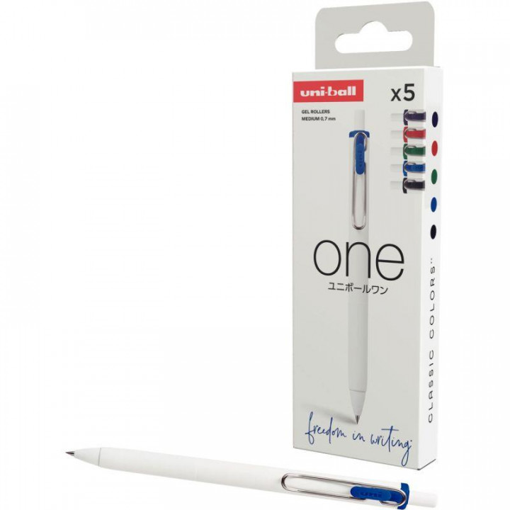 Pochette de 5 rollers One classique assortis. Écriture fluide moyenne, pointe 0,7mm, tracé 0,5mm. Clip ultra-solide. Grip soft-touch anti dérapant. Couleurs intenses et lumineuses. Coloris : Bleu, noir, rouge, vert, violet.