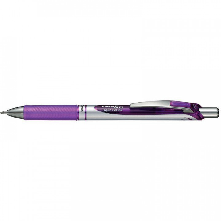 Roller Energel BL77 violet. Séchage très rapide de l'encre. Idéal pour les gauchers. Encre fluide et lumineuse, grand confort et douceur d'écriture. Ne fuit pas, ne bave pas. Équipé d'un grip caoutchouc confort et d'un clip. Rechargeable. Pointe moyenne 0,7 mm. Encre violette.