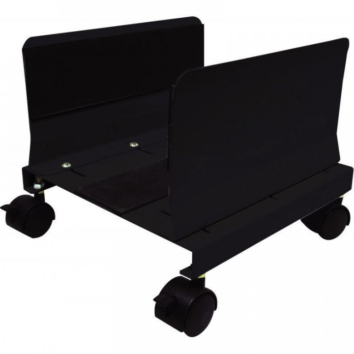 Support unité centrale mobile noir. Ajustable de 15,2 à 22,9cm en largeur. Réduit l'échauffement et protège des nuisances. 4 roulettes dont 2 avec frein, assurent mobilité et stabilité. Libère de l'espace. Structure en métal avec protection à l'intérieur. Supporte jusqu'à 23kg.