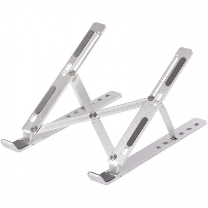 Support ordinateur ultra portable. Support en aluminium léger (260gr) et ultra robuste. Patins antidérapants et supports en silicone. 6 angles d'inclinaison possible. Housse pour le transport. Dim: 24x4,5x1,5cm (plié) et 25x18x15cm (déplié).