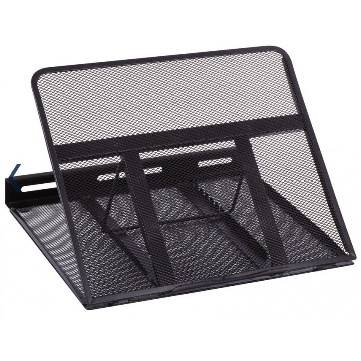 Support métal ventilé pour ordinateur portable Mesh noir. Structure en métal aérée pour une meilleure ventilation de l'ordinateur. Facile à transporter une fois replié. Tampons mousse antidérapants et de protection. Dim: L33xP28,5xH3,8cm (replié).