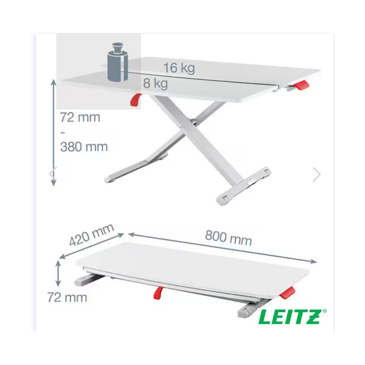 Station de travail assis/debout Leitz Ergo Cosy avec plateau coulissant. Réglage pneumatique de la hauteur pour basculer facilement et sans effort entre les positions assise et debout. Supporte un moniteur et un ordinateur portable avec support sur la surface principale et le plateau coulissant contient un clavier et une souris avec un espace pour les repose-poignets. Encombrement ultra-compact de 800 x 350. Hauteur minimale 68 mm, hauteur maximale 447 mm. Supporte jusqu'à 16 kg sur la surface principale et 8 kg sur le plateau coulissant. Garantie 2 ans.
