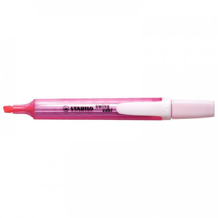 Surligneur Swing Cool rose. Encre fluorescente universelle à base d'eau. Habillage effet "givré". Résistance intense à la lumière. Avec agrafe. Pointe biseautée: 2 largeurs de tracé de 1 à 4mm.