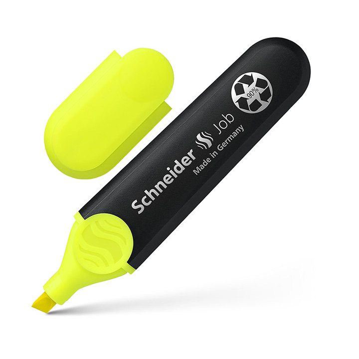 Surligneur Job jaune. Pointe biseautée pour trait d'écriture de 1 à 5mm. Encre universelle pour papier normal, photocopie et fax.