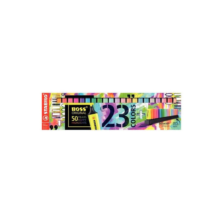 Set de bureau 23 surligneurs Boss assortis. La palette complète de 23 couleurs. Set en plastique et emballage carton 100% recyclé. 9 couleurs fluos et 14 couleurs pastels, largueur de tracé : 2 à 5 mm.