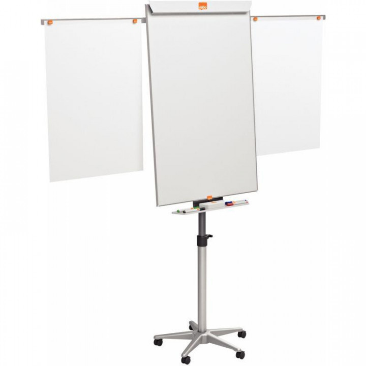 Chevalet de conférence magnétique Classic mobile Nano Clean. Fond en métal permettant l'écriture et l'affichage par aimants. Technologie Nano Clean pour une excellente effaçabilité. Barrette pivotante pour le changement des blocs papiers et crochets ajustables. 2 potences d'affichage latérales pour tripler la surface d'affichage possible. Porte-marqueurs design. Pied central avec hauteur ajustable facilement de 175 à 200 cm. Socle stable et mobile. Livré avec 1 marqueur. Bloc papier non fourni. Garantie de 15 ans sur la surface en acier laqué.