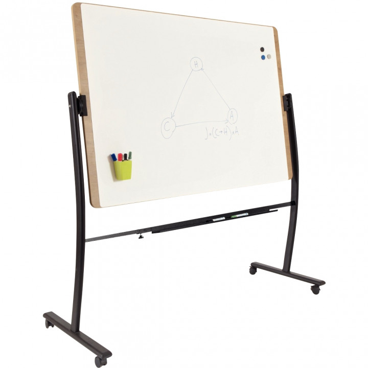 Tableau blanc rotatif Natural 100x141cm. Magnétique double face. Pivote à 360° sur un axe horizontal pour pouvoir utiliser les 2 faces sans avoir à déplacer le tableau. 4 roulettes avec freins. Porte-marqueurs intégré. Surface d'écriture: 2x100x141cm. Dim: 172x162x64cm. Poids 38,35kg. Garantie 2 ans.