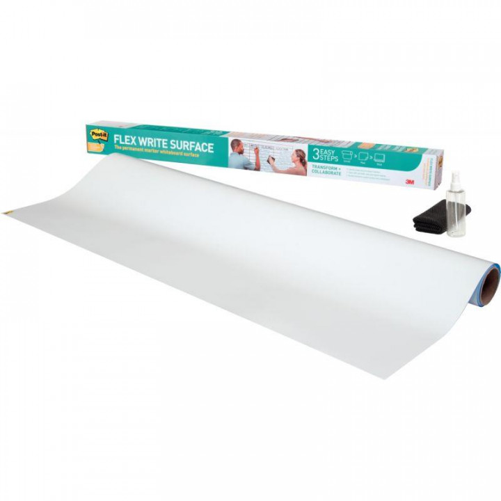 Tableau blanc Easy Erase Post-It Lg 122 x lg 91,4 cm en rouleau. Personnalisez votre espace de travail en vous procurant de la Surface Flex Write Post-it®. Ce tableau blanc peut être utilisé avec un marqueur permanent sans laisser de tache ou d’ombre. Finition mate anti-reflet. Pour nettoyer, essuyez les traces de marqueur effaçable à sec avec un chiffon et les traces de marqueur permanent avec de l’eau et un chiffon (aucun produit chimique nécessaire). Adhère fermement et s’enlève facilement et sans dommages. Garantie 3 ans.