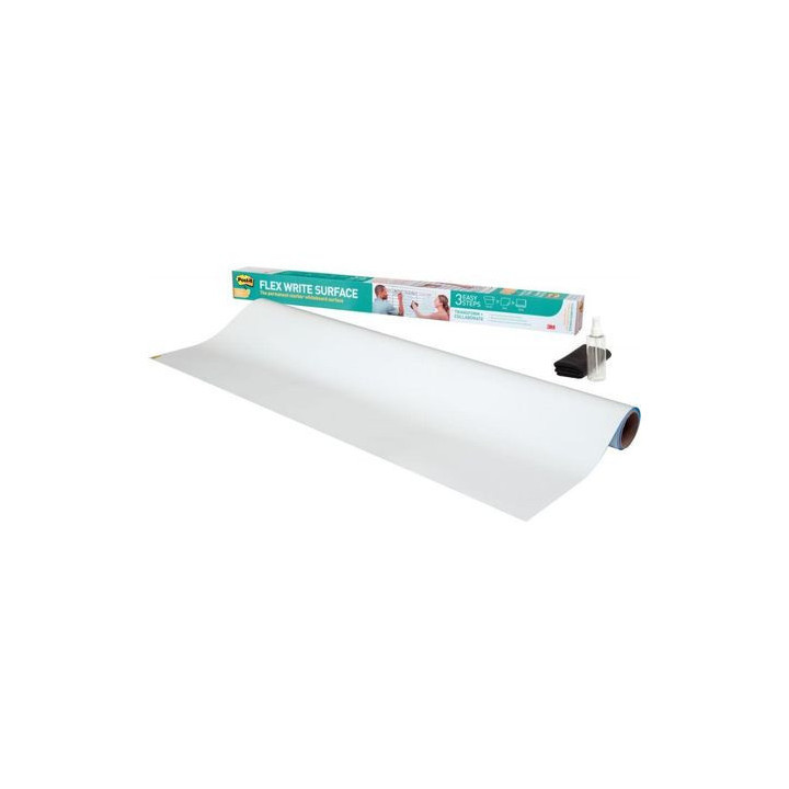 Tableau blanc Erasy Erase Post-It Lg 183 x lg 122 cm en rouleau. Personnalisez votre espace de travail en vous procurant de la Surface Flex Write Post-it®. Ce tableau blanc peut être utilisé avec un marqueur permanent sans laisser de tache ou d’ombre. Finition mate anti-reflet. Pour nettoyer, essuyez les traces de marqueur effaçable à sec avec un chiffon et les traces de marqueur permanent avec de l’eau et un chiffon (aucun produit chimique nécessaire). Adhère fermement et s’enlève facilement et sans dommages.