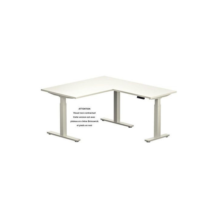 Bureau électrique Slade L180xP80cm avec retour plateau chêne brunswick/piètement noir. Avec retour L80xP60cm. Gestion globale de l'ajustement en hauteur bureau + retour via la commande digitale centralisée. 3 moteurs. Garantie 5 ans.