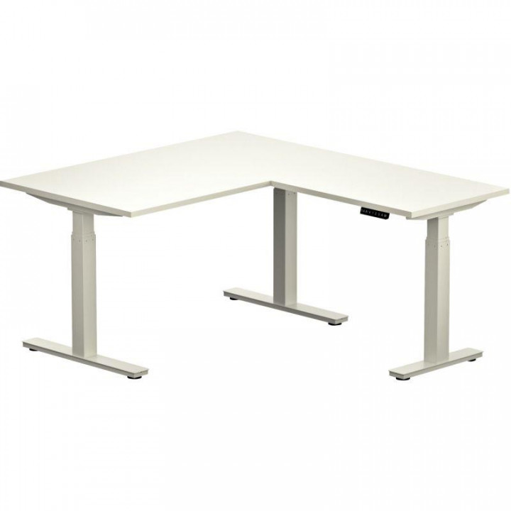 Bureau électrique Slade L180xP80cm avec retour plateau blanc/piètement blanc. Avec retour L80xP60cm. Gestion globale de l'ajustement en hauteur bureau + retour via la commande digitale centralisée. 3 moteurs. Garantie 5 ans.