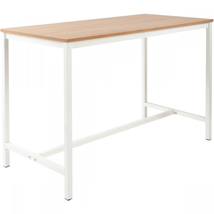 Table haute L160xP80cm plateau chêne/piètement blanc. Plateau épaisseur 25 mm, chant ABS 2 mm avec cadre porteur et piétement carré 40x40mm sur vérins de réglage. Garantie 5 ans.