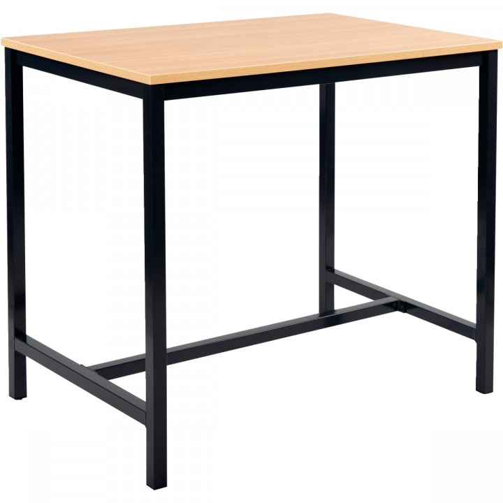 Table haute L160xP80cm plateau hêtre/piètement noir. Plateau épaisseur 25 mm, chant ABS 2 mm avec cadre porteur et piétement carré 40x40mm sur vérins de réglage. Garantie 5 ans.