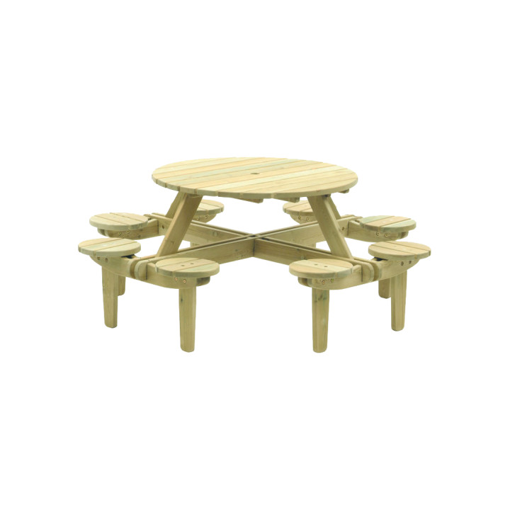 Table de pique nique ronde en pin FSC. Idéal pour profiter d'agréable repas en extérieur jusqu'à 8 personnes.