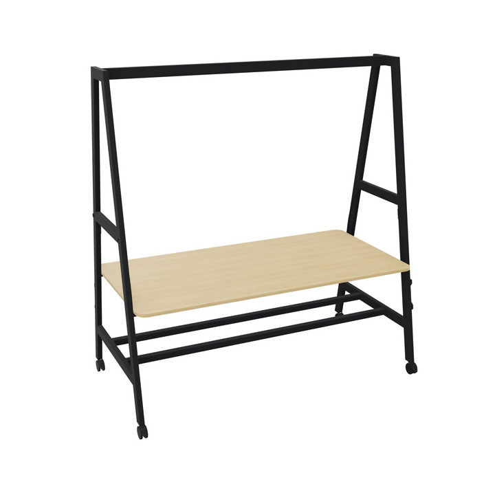 Table mobile L180xP90cm Nomad plateau chêne naturel/structure noir. Modulaire dynamique. Plan de travail en panneau de particules mélaminé. Epaisseur 19mm, Ajustable en hauteur en 2 positions grâce à un mécanisme sous le plateau et des rails de guidage insérés dans les piètements: assis (H73,5cm) ou debout (H104,5cm). 2 faces décor antireflets. Chants plats ABS 2mm assortis. Coins arrondis. Classement au feu M3 selon norme NF EN 13501-1. Structure métallique, peinture époxy. Piètement arche type "A", section 60x30mm. Double repose-pieds section 40x40mm. 4 roulettes avec frein Ø75mm. Garantie 5 ans.