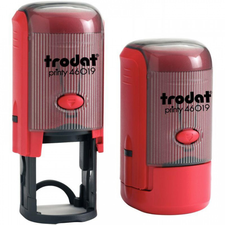 Tampon à encrage automatique Printy 46019 rond, texte jusqu'à 4 lignes, plaque ronde diamètre 19 mm. Monture plastique. Cassette d'encrage en plastique et mousse encrée. Encre à base d'eau, non toxique. Encrage noir. IDEAL POUR LES TAMPONS OFFICIELS.