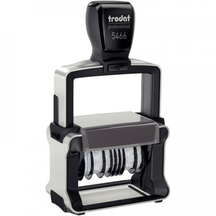 Dateur à encrage automatique Professional 5466PL Double Date, texte jusqu' à 4 lignes à personnaliser, plaque format 56 x 33 mm. En acier inoxydable pour utilisation en entreprise, idéal pour les usages répétés. Encrage automatique rechargeable. 2 Lignes + 2 dates + 2 lignes. Fabriqué à base de plastique recyclé. neutre en CO2. Cassette encrage noire fournie.