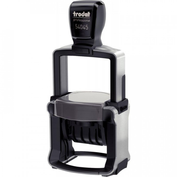 Dateur à encrage automatique Professional 54045, texte jusqu' à 6 lignes à personnaliser, plaque diamètres 40-42-45 mm. En acier inoxydable pour utilisation en entreprise, idéal pour les usages répétés. Encrage automatique rechargeable. Encre a base eau. 3 lignes + date + 3 lignes Fabriqué à base de plastique recyclé. neutre en CO2. Cassette encrage noire fournie