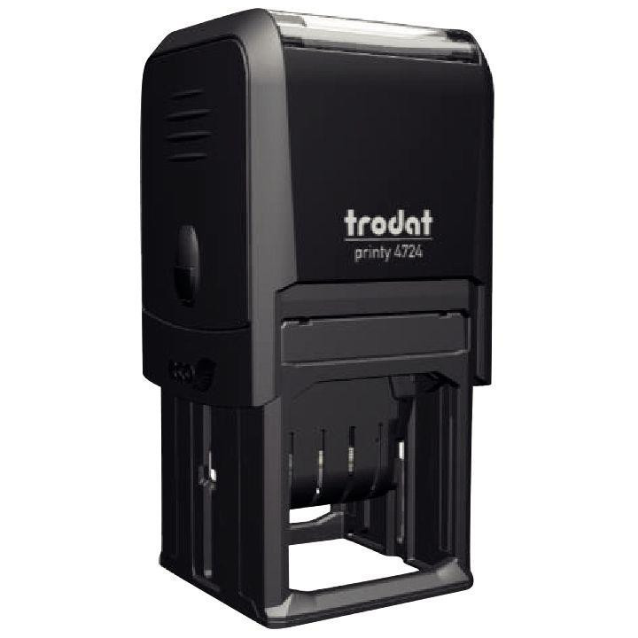 Dateur à encrage automatique Printy 4724, texte jusqu'à 6 lignes à personnaliser, plaque format 40 x 40 mm. Dimension de la date : 3 mm. Réglage de la date par molette. Équipé d'une cassette noire Monture plastique. Cassette d'encrage en plastique et mousse encrée. Encre à base d'eau, non toxique. Fabriqué à base de plastique recyclé. neutre en CO2.