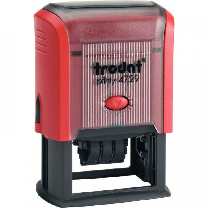 Dateur à encrage automatique Printy 4729, texte jusqu'à 6 lignes à personnaliser, plaque format 50 x 30 mm. Dimension de la date : 4 mm. Équipé d'une cassette noire. Pour 3 + 3 lignes de textes Monture plastique. Cassette d'encrage en plastique et mousse encrée. Encre à base d'eau, non toxique. Fabriqué à base de plastique recyclé. neutre en CO2.