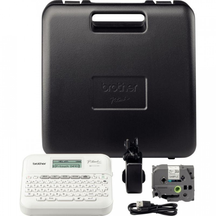 Titreuse Brother PT-D410VP. Rubans TZe de 3.5 à 18mm. Imprime jusqu'à 5 lignes. Cutter manuel. Plus de 700 symboles. Livrée avec une mallette, adaptateur secteur, 1 micro cable USB et 1 ruban de 18mm. Garantie 2 ans.