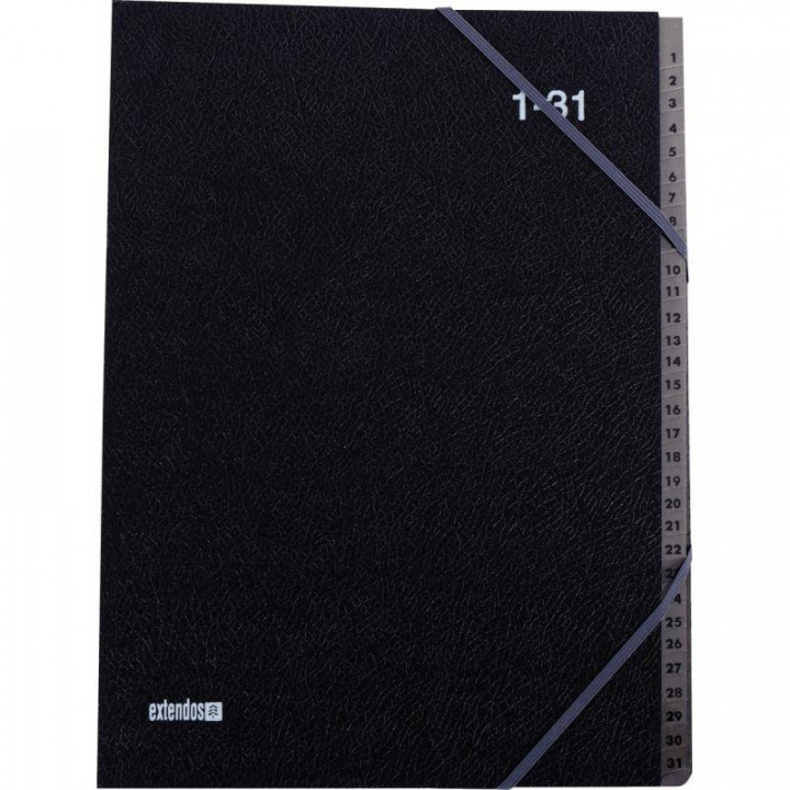 Trieur numérique en celloderme 31 compartiments, noir. Couverture noire en carton celloderme grainé, intérieur gris foncé. Onglets gris renforcés Mylar numérotés de 1 à 31. Dos extensible. Fermeture par élastiques en coins. Format 24x32cm pour format A4. Livré avec un porte-étiquette adhésif + étiquette à coller sur la couverture.