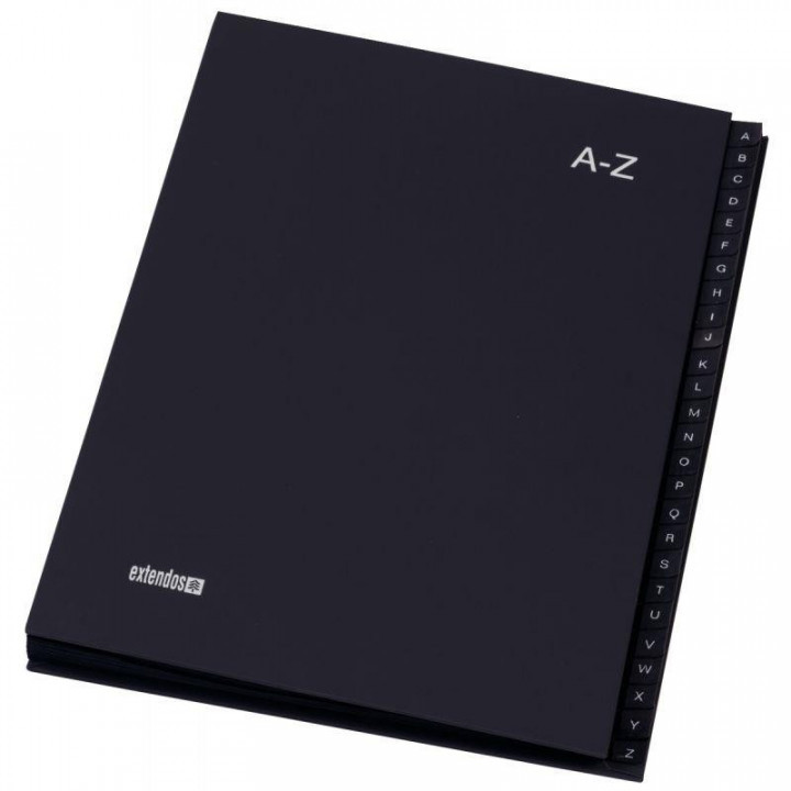 Trieur alphabétique 26 compartiments, gris. Couverture carton fort recouvert de balacron. Onglets découpés, imprimés et renforcés. Format 24x32 cm pour documents A4.