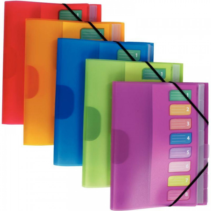 Trieur en polypropylène 3 rabats + élastiques COLOR FRESH 8 compartiments, coloris assortis. Fenêtres découpées avec un porte-étiquette multicolore et numéroté. Intercalaires en polypropylène translucide incolore. Couverture en polypropylène translucide coloré semi rigide 5/10ème. Fermeture par élastiques. Chemise 3 rabats intégrée sur la 3ème de couverture. Pour document A4. Format 24 x 32 cm. Livraison selon 5 coloris vifs disponibles : rouge, jaune orangé, vert clair, bleu roi et violet.