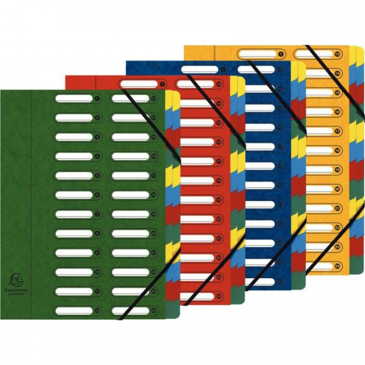 Trieur en carte lustrée avec élastiques 24 compartiments, fenêtres découpées. Format 24 x 32 cm pour document A4. Intérieur multicolore en carte 250g. Dos extensible à soufflet. 4 coloris assortis : bleu, rouge, vert et jaune.