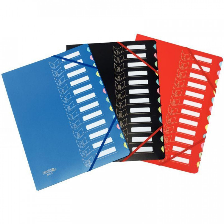 Trieur en polypropylène avec élastiques 12 cases noir. Couverture en polypropylène imprimée, fenêtres découpées. Intérieur carte. Dos extensible, feuillets multicolores, onglets découpés, fermeture par élastique en coins. Trou de visualisation. Format : 24x32 cm. Coloris noir.