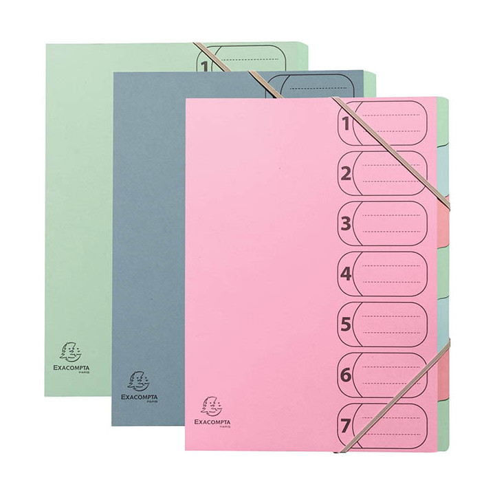 Trieur en carte recyclée AUTENTIK 7 compartiments, coloris assortis. La gamme AUTENTIK est entièrement conçue à partir de déchets collectés et triés. Une vraie prouesse pour réduire l’empreinte carbone et la masse de déchets non recyclés. Couverture en carte recyclée 400g 5/10ème teintée dans la masse, sans impression, sans pelliculage ou film plastique. Intérieur en carte recyclée 220g. Fenêtres numérotées et imprimées. Dos extensible, ouverture à plat. Fermeture par élastiques. Format 24x32 cm pour documents A4. Capacité 350 feuilles. 3 coloris assortis : bleu gris, rose candy et vert sauge.