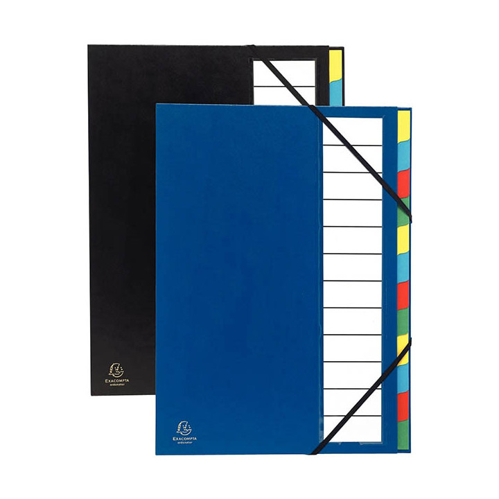 Trieur rigide ORDONATOR 12 compartiments, coloris assortis. Trieur grande capacité grâce au dos extensible. Couverture balacron 18/10ème collée-rembordée, compartiments multicolores en carte 225g avec onglets plastifiés. Avec un grand porte-étiquette + étiquettes, une pochette CD et une pochette carte de visite à l'intérieur de la couverture. Format 23,5 x 33,5 cm pour documents A4 à classer. Capacité 600 feuilles. Fermeture par élastiques. 2 coloris disponibles : noir et bleu.