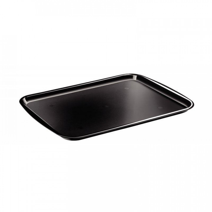 Plateau rectangulaire noir. Accueil de qualité avec ce plateau de grande dimension, au design sobre et très résistant. Parfaitement empilable pour un rangement facilité. Dimensions hors tout : 532 x 372 H 20mm Polycarbonate