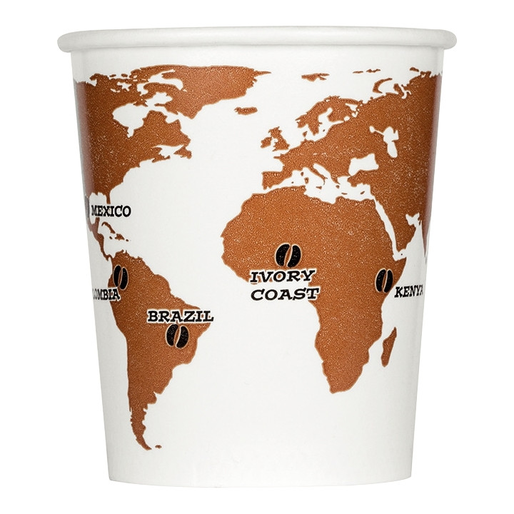 Paquet de 120 gobelets World Map 11.5cl. En carton imprimé blanc et marron PEFC Made in France 11.5cl pour boissons chaudes (jusqu'à 100°C). Contenance : 11.5 cl Diamètre : 63 mm 100 % Biodégradable, compostable et recyclable