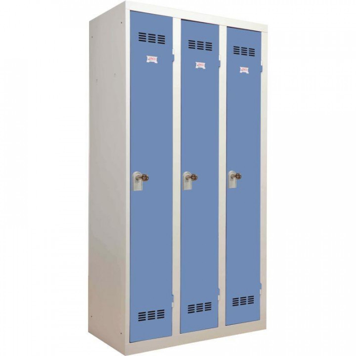 Vestiaire d'atelier 3 portes industrie propre L90cm portes bleu/corps gris. Monobloc. Peinture époxy. Assemblage sans vis ni boulon. Equipé d'une tablette, d'une tringle porte-cintres et d'un crochet portemanteau. Fermeture par moraillon porte-cadenas (cadenas non fourni). H180xP50cm. Porte indégondable, ouverture 180°, NFD65-760. Porte étiquette embouti. Niveau de résistance à l'effraction classe C. Garantie 5 ans.
