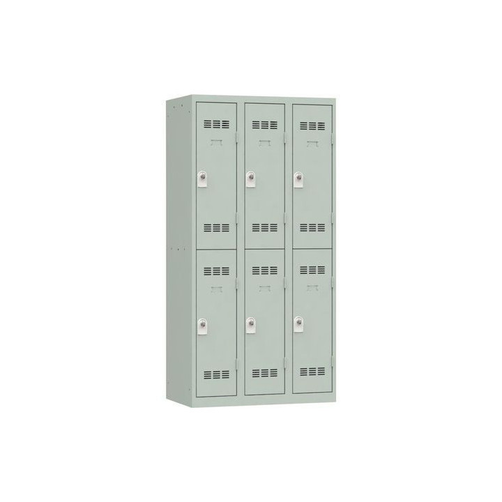Vestiaire d'atelier 3 colonnes 6 cases industrie propre L90cm gris. Monobloc. Peinture époxy. Assemblage sans vis ni boulon. Equipé d'une tablette, d'une tringle porte-cintres et d'un crochet portemanteau. Fermeture par moraillon porte-cadenas (cadenas non fourni). H180xP50cm. Porte indégondable, ouverture 180°, NFD65-760. Porte étiquette embouti. Niveau de résistance à l'effraction classe C. Garantie 5 ans.