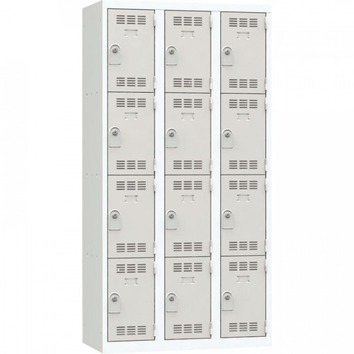 Vestiaire d'atelier 3 colonnes 12 cases industrie propre L90cm gris. Monobloc. Peinture époxy. Assemblage sans vis ni boulon. Equipé d'une tablette, d'une tringle porte-cintres et d'un crochet portemanteau. Fermeture par moraillon porte-cadenas (cadenas non fourni). H180xP50cm. Porte indégondable, ouverture 180°, NFD65-760. Porte étiquette embouti. Niveau de résistance à l'effraction classe C. Garantie 5 ans.
