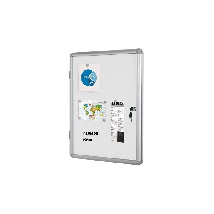 Porte battante avec façade en plexiglas de 3 mm. Encadrement aluminium anodisé. Serrure de sécurité avec 2 clés. Epaisseur utile 1,8 cm. Livrées avec vis et chevilles pour fixation.